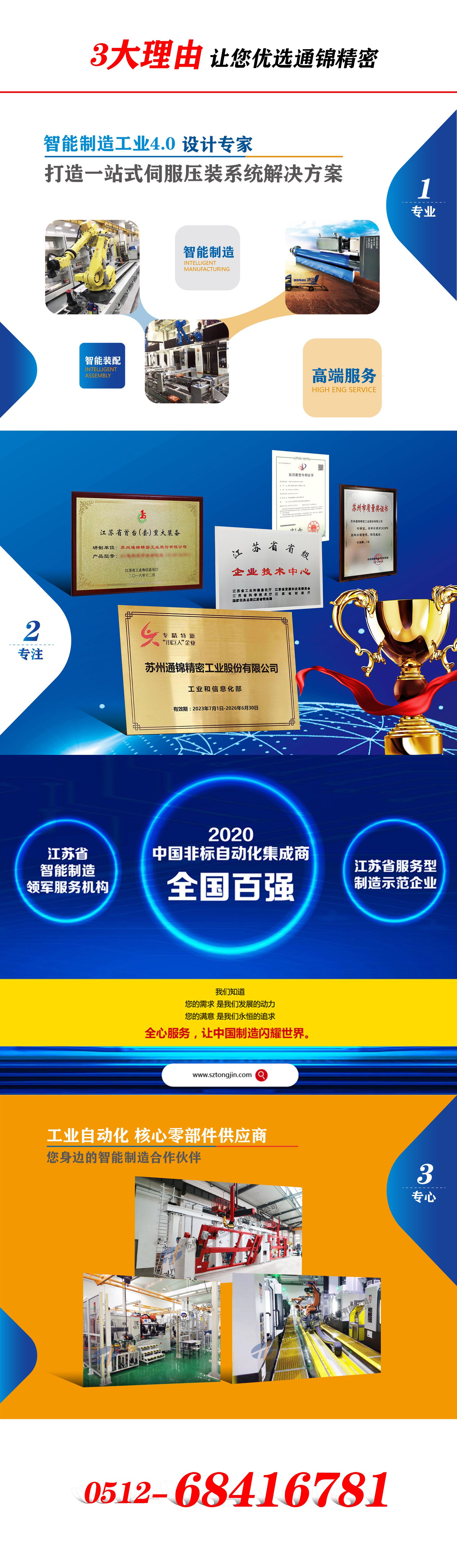 多年來公司一直以“工廠實(shí)現(xiàn)綠色無人化”為愿景;以“通向世界、錦繡中華”為使命;以“創(chuàng)新、進(jìn)取、誠信、和諧”為企業(yè)核心價(jià)值觀。公司在引進(jìn)國外高尖端自動(dòng)化核心元件的基礎(chǔ)上,大力投入研發(fā)資金,主要針對(duì)新能源汽車,光伏、5G、儲(chǔ)能電池等行業(yè)智能伺服裝配技術(shù)需求,已成功自主研發(fā)、設(shè)計(jì)、組裝、銷售通錦牌伺服電動(dòng)缸、智能伺服壓裝機(jī)、第七軸機(jī)器人、(重型)桁架機(jī)器人等自主產(chǎn)品,結(jié)合六關(guān)節(jié)機(jī)器人實(shí)現(xiàn)自動(dòng)化、安全化、無人化的智能裝配綠色無人化生產(chǎn)線,提供一站式工廠智能裝配自動(dòng)化系統(tǒng)整體解決方案,實(shí)現(xiàn)工業(yè)4.0。同時(shí)為客戶提供高端貿(mào)易品牌工控核心零部件:意大利Gambini齒輪齒條、Panasonic伺服系統(tǒng)、Rexroth變頻器、Nidec減速機(jī)、APEX減速機(jī)。